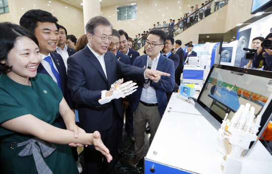 문재인 대통령이 19일 오후 경기도 성남시 분당서울대병원 헬스케어혁신파크에서 열린 의료기기 규제혁신 방안 발표 행사를 마친 뒤 의료기기 전시 부스를 방문, 네오팩트의 재활 치료용 글러브를 끼고 탁구 게임을 하고 있다. 이날 문 대통령은 하반기 혁신성장 첫 방문지로 분당서울대병원 헬스케어 혁신파크를 찾았다.