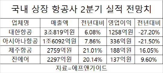 LCC들이 고공행진을 예고한 가운데 대형항공사들의 영업이익은 작년보다 두 자릿수나 빠지며 뒷걸음질칠 것으로 전망됐다. 대한항공은 올해 2분기 매출 3조819억원, 영업이익 1258억원을 기록할 것으로 관측됐다. 매출은 작년 같은 기간보다 6.08% 증가하지만, 영업이익은 27.20% 감소한 것이다. 아시아나항공 역시 매출액은 7.86% 늘어난 1조6092억원을 기록할 것으로 관측됐지만, 영업이익은 21.50% 줄어든 336억원에 그칠 전망이다.
