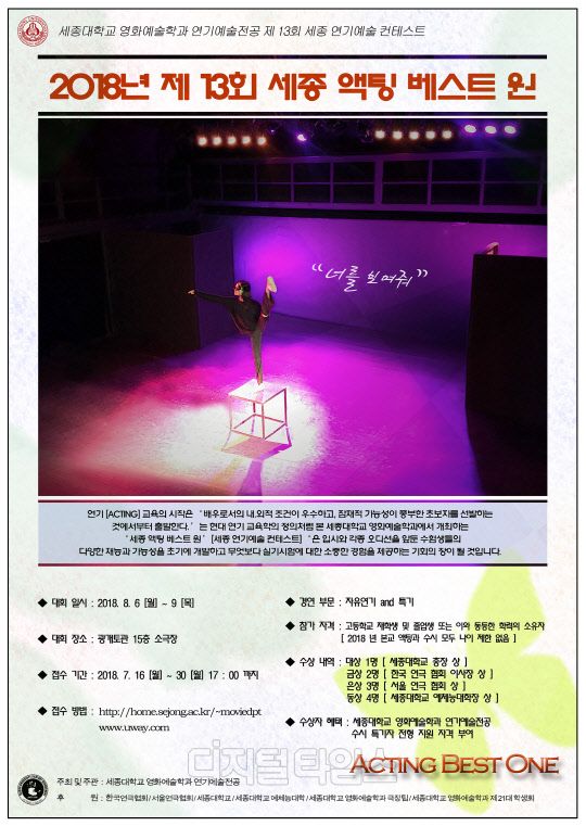 세종대 영화예술학과 연기예술전공이 주최하는 이번 콘테스트는 고등학교 재학생, 고등학교 졸업생, 또는 이와 동등한 학력이 소유자를 대상으로 한다. 접수비는 9만원이며 반드시 인터넷 접수를 해야 콘테스트에 참여할 수 있다.