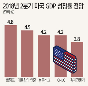 [디지털타임스 윤선영 기자]글로벌 무역전쟁 속에서도 지난 2분기 미 GDP(국내총생산)가 4% 안팎의 성장세를 보일 것이라는 관측이 나오고 있다. 올 1분기에 비해 두 배 이상 성장한 수치다.