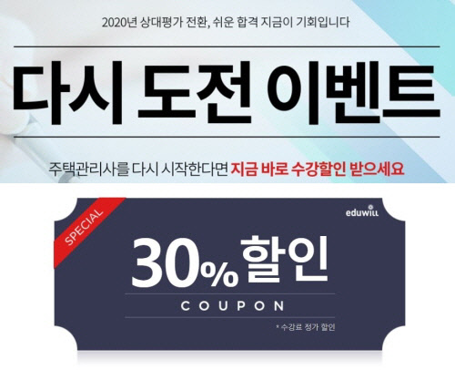이는 '에듀윌 주택관리사 다시 도전 이벤트'로 진행되며, '주택관리사 100% 환급 평생회원반' 또는 '주택관리사 2019 합격완성반'의 수강료 정가에서 30% 할인을 받을 수 있다.