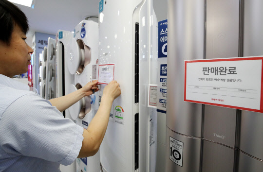 29일 서울의 한 전자제품 판매점에서 직원이 판매완료된 에어컨에 안내문을 붙이고 있다. 가전업계에 따르면 올여름 기록적인 폭염이 이어지면서 국내 에어컨 판매 대수는 역대 최고치인 260만대에 달할 것으로 추정됐다.