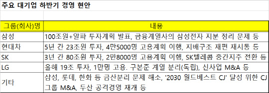 [디지털타임스 박정일 기자] 올 하반기 재계 대표인 삼성전자를 시작으로 주요 대기업들의 경영 행보가 빨라질 전망이다. 문재인 정부의 경제·일자리 창출 살리기 요청에 응해야 하고, 또 그룹별로 예고한 조직재편 시점이 임박했기 때문이다.