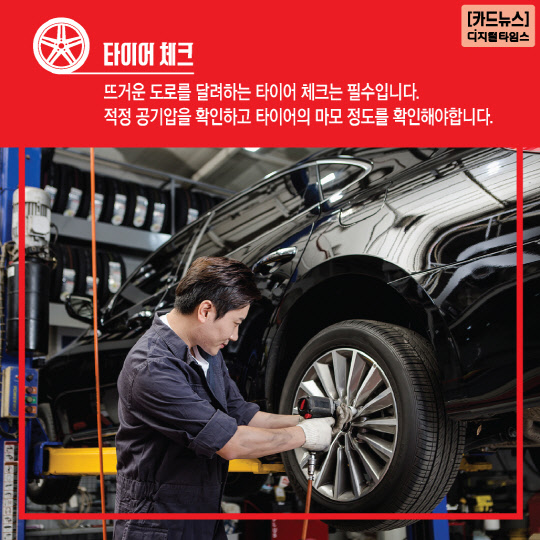 뜨거운 도로를 달려하는 타이어 체크는 필수입니다. 적정 공기압을 확인하고 타이어의 마모 정도를 확인해야합니다.