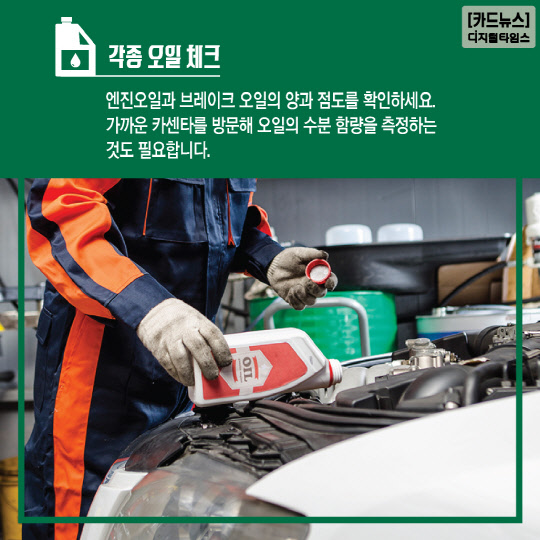 엔진오일과 브레이크 오일의 양과 점도를 확인하세요. 가까운 카센타를 방문해 오일의 수분 함량을 측정하는 것도 필요합니다.