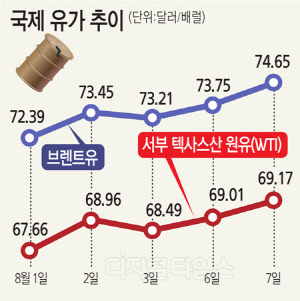 브렌트유, 1.22% ↑ 74.65달러 사우디 생산량 감소도 상승 영향 미 원유재고 줄어 계속 오를 듯