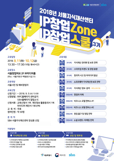 SBA 서울지식재산센터는 오는 9월 11일부터 10월 12일까지 총 10일 동안 'IP창업ZONE IP창업스쿨 3기' 교육과정을 진행한다고 밝혔다.