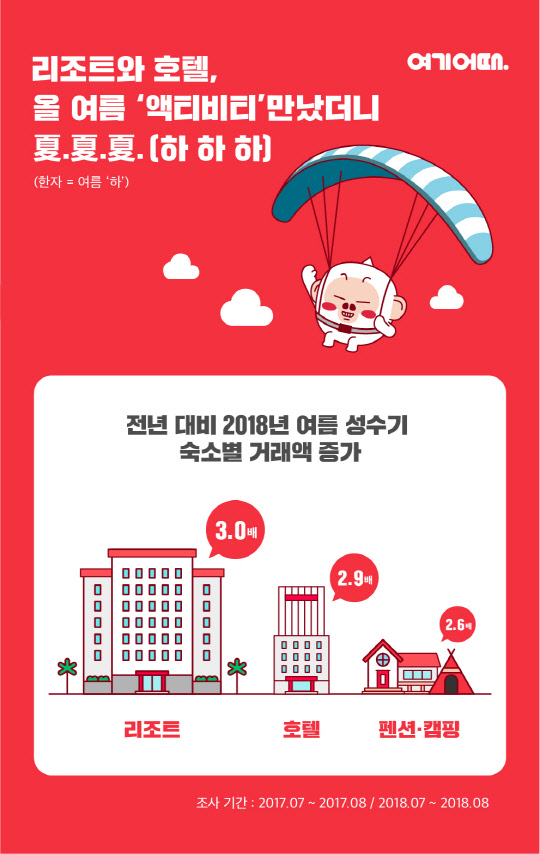여기어때가 지난 6월 말, 액티비티 예약 서비스를 시작하며 호텔과 리조트의 예약 거래 매출이 3배 상승했다고 28일 밝혔다. 여기어때는 지난 6월 말 종합숙박 앱 서비스 중 처음으로 국내 액티비티 예약에 나서면서 호텔과 리조트 예약으로 이어진 것으로 보인다.