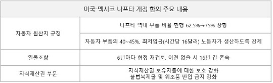 양국은 이번 협상에서 △자동차부품 원산지 규정 △일몰조항 △투자자-국가 간 소송(ISD) 등을 주요 쟁점으로 다뤘다. 그 결과 멕시코에서 생산한 자동차가 미국에 무관세로 수출되기 위한 조건인 나프타 역내 부품 비율이 현행 62.5%에서 75%로 상향됐다. 또 최저임금(시간당 16달러) 노동자 생산 비중은 40%로 결정됐다. 개정 논의에서 가장 큰 장애물로 지적돼왔던 일몰조항은 미국이 한 발짝 물러나며 합의했다. 미국과 멕시코는 6년마다 협정을 재검토하되, 이견이 없으면 16년 간 존속하기로 했다.