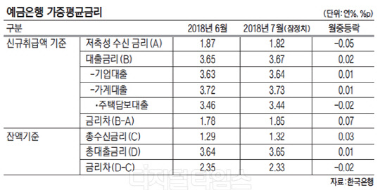 한국은행이 28일 낸 '2018년 7월 중 금융기관 가중평균금리'에 따르면 지난달 예금은행의 신규취급액 기준 저축성수신금리는 연 1.82%로 전월대비 5bp(1bp=0.01%포인트) 하락했다. 반면 대출금리는 연 3.67%로 2bp 올랐다.