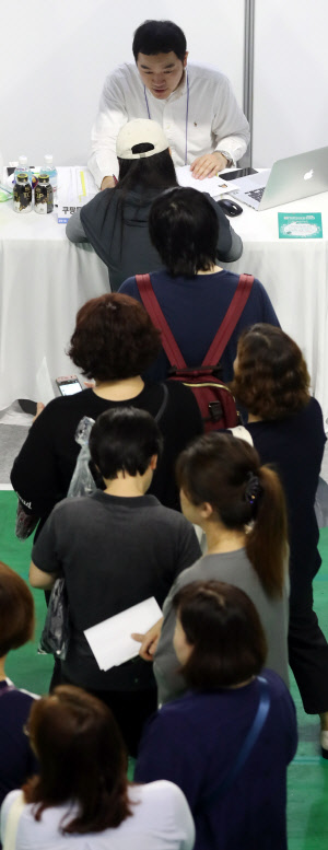 정부가 2019년 일자리 예산에만 23조5000억 원을 지출키로 한 28일 오후 인천시 부평구 삼상월드체육관에서 열린 '2018 인천 여성 취업·창업 종합박람회'에서 구직자들이 줄지어 면접을 보고 있다.