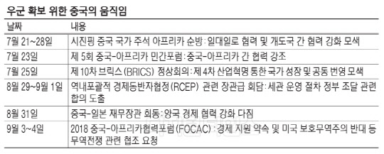 아프리카에 협력 메시지 일대일로 600억달러 지원 약속 보호무역주의 반대 이끌어내 싱가포르서 RCEP 협상 속도 16개국, 18개 중 4개 항목 합의 타결 서둘러 주도권 확보 포석 일본과 경협 강화 움직임 지난달 베이징서 양국 만남 아베총리 내달 中 방문 가능성
