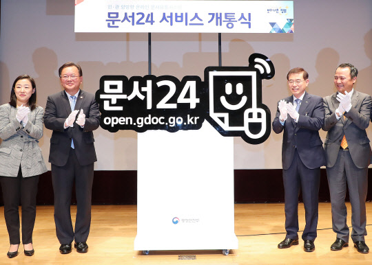 김부겸 행정안전부 장관(왼쪽 두번째)이 3일 오전 서울 세종로 정부서울청사에서 열린 '문서24' 서비스 개통식에서 지대범(세번째) 한국지역정보개발원장 등 관계자들과 제막식을 한 뒤 박수를 치고 있다.