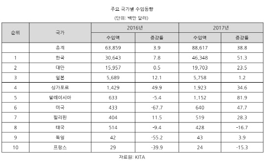 이 가운데 한국산 수입이 전체의 52.3%에 달하는 463억4800만 달러로 집계됐다. 전년보다 51.3%나 늘어난 것으로, 전체 수입에서 차지하는 비중도 전년 48.2%에서 50%를 넘어섰다.