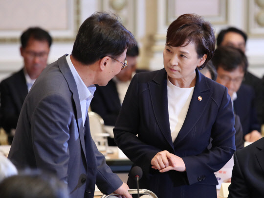 장하성 청와대 정책실장(왼쪽)과 김현미 국토교통부 장관이 6일 오후 청와대 영빈관에서 열린 2018 포용국가 전략회의에서 만나 얘기를 나누고 있다.
