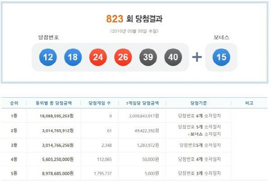 나눔로또는 제823회 로또복권 추첨에서 '12, 18, 24, 26, 39, 40'이 1등 당첨번호로 뽑혔다고 8일 밝혔다.