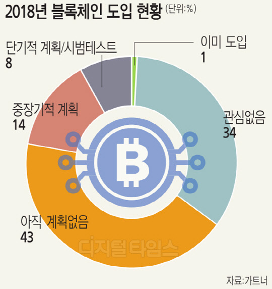 10일 가트너의 '블록체인 현황 2018: 시장 도입 현실' 보고서에 따르면 세계 각국 기업의 최고정보책임자(CIO) 중 1%만이 블록체인 기술을 실제로 도입한 것으로 조사됐다.