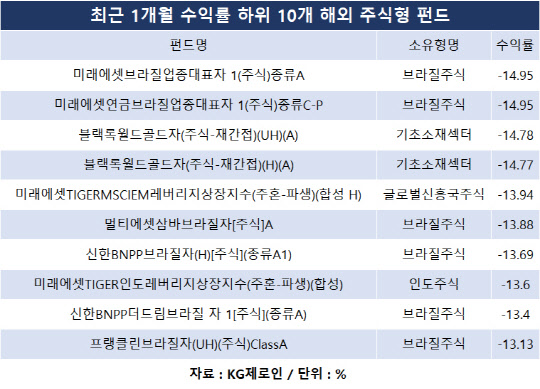 같은 기간 전체 해외 주식형 펀드의 평균 수익률이 -4.56%인 점에 비춰보면 브라질펀드의 손실은 더욱 두드러진다.