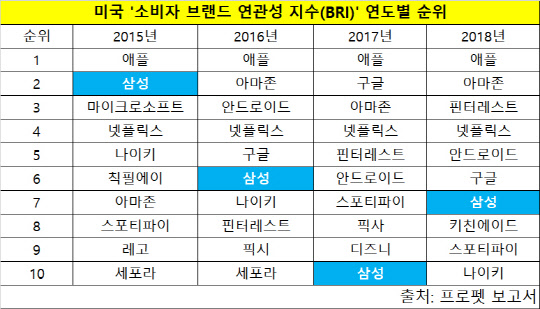 17일 업계에 따르면 미국 샌프란시스코에 본사를 둔 브랜드 컨설팅 전문업체 '프로펫'이 최근 집계·발표한 '2018년 브랜드 연관성 지수(BRI)'에서 삼성전자는 7위를 기록했다.