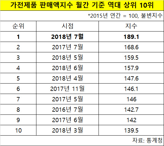 17일 통계청의 7월 소매판매액 통계 가운데 '재별 및 상품군별 판매액지수'를 보면 가전제품의 불변지수는 189.1을 기록, 조사를 시작한 2005년 1월 이후 역대 최고치를 찍었다.