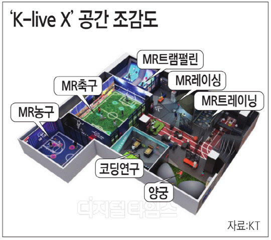 KT는 20일 롯데백화점, KTH와 공동으로 롯데백화점 부천 중동점에 MR(혼합현실)기술을 적용한 어린이 스포츠 체험공간 'K-live X'를 오픈했다.