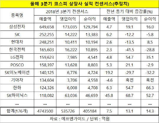 20일 금융정보업체 에프엔가이드에 따르면 3곳 이상의 증권사가 추정한 실적 컨센서스(추정치)가 있는 코스피 상장사 176개 기업들을 대상으로 분석한 결과, 올 3분기 전체 영업이익 컨센서스는 53조5726억원으로 전년 동기 대비 13.1% 증가할 것으로 집계됐다. 같은 기간 매출액과 순이익은 474조3500조억원, 40조5184억원으로 7.5%, 13.1% 각각 증가할 것으로 추산된다.