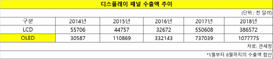 27일 관세청에 따르면 올해 1월부터 8월까지 OLED 패널 수출액은 10억7778만달러(1조2017억원)를 기록했다. 지난해 같은 기간의 7억3704만달러(8217억원)보다 46% 증가해, 2014년 관련 통계가 집계된 이후 꾸준히 증가하고 있다.