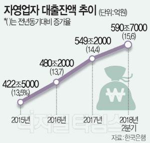 자영업자 대출도 2분기 기준으로 590조7000억원에 달한다. 금리 0.1%포인트 인상 때 5900억원의 이자 부담이 쌓인다. 한은이 지난해 낸 '국내 자영업의 폐업률 결정요인 분석' 보고서에 따르면 자영업자 가운데 큰 비중을 차지하는 음식업의 폐업률은 23.5%에 달했다. 도·소매업은 각각 19.0%, 12.9%다. 자영업자 수는 570만명으로 그 비중은 25%에 달한다.