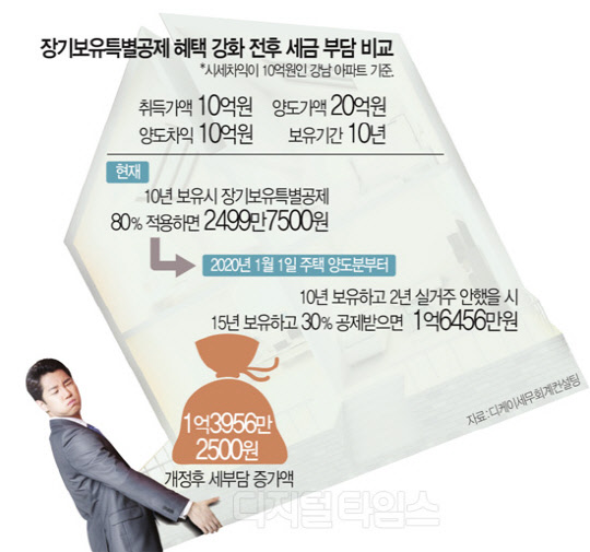 27일 더케이세무회계컨설팅의 김정래 세무사에 따르면 취득가액 10억원, 실거래가 20억원으로 예상 양도차익이 10억원인 강남 아파트를 10년 장기 보유한 A씨의 경우 현재는 80%의 장기보유특별공제 혜택이 적용돼 집을 팔면 양도세로 2500만원만 내면 된다.