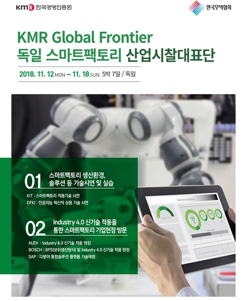 한국경영인증원과 한국무역협회에서 공동으로 추진하는 독일 스마트팩토리 산업시찰대표단은 11월 12일 ~ 11월 18일 5박 7일 일정으로 진행되며, 해외의 4차 산업혁명 신기술과 동향을 통하여 한국제조업의 미래모델을 벤치마킹하는 프로그램으로 구성되어 있다. 독일의 Industry 4.0 기술이 적용된 미래형 제조기업과 연구시설 방문이 예정되어 있으며, 이를 통해 창의적이고 혁신적 생산과정, 다품종 소량생산방식 등 최신 스마트팩토리 구축을 목표로 하는 국내 제조 기업들에게 비전을 제시한다.