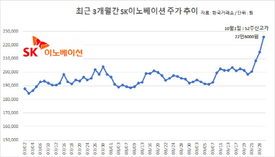 1일 오후 1시55분 현재 코스피시장에서 SK이노베이션은 전 거래일 대비 4.65% 상승한 22만5000원에 거래되고 있다. SK이노베이션은 장중 한때 22만6000원까지 치솟으며 지난달 28일 기록한 52주 신고가를 또다시 갈아치웠다. SK이노베이션 주가는 3개월 전(7월2일) 기록한 18만8000원과 기록해 이날 현재까지 약 20% 급등했다. 같은 기간 17조4000억원에 불과했던 시총은 이날 20조8500억원을 넘어섰다. 지난달 28일 SK이노베이션 종가 기준 시총은 19조9000억원으로 20조원을 밑돌았다.