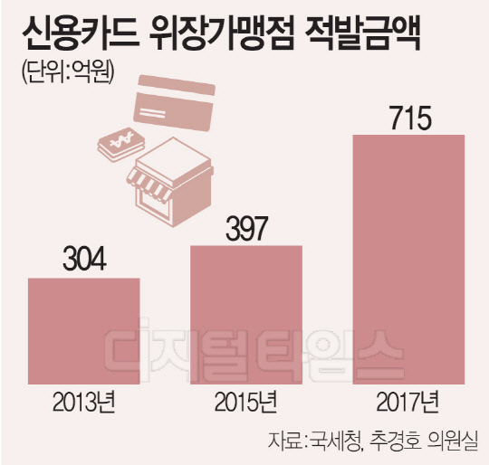 9일 국회 기획재정위원회 소속 추경호 의원(자유한국당)이 국세청으로부터 받은 '신용카드 위장가맹점 적발 현황'에 따르면 2013년부터 2017년까지 최근 5년간 총 7733건의 위장 가맹점이 적발되고, 7073개 업소가 폐업처리됐다.