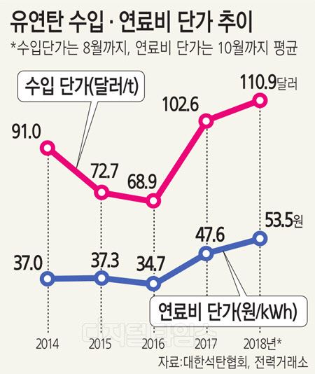 유연탄 수입단가가 급등하는 것은 해외 메이저 석탄채굴업체들의 잇단 폐광으로 인해 공급이 줄어드는 데 따른 것으로, 이 때문에 국내 석탄화력발전의 연료비 단가도 가파르게 오르고 있다.