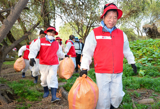 LG화학은 지난 15일 박 부회장을 비롯해 50여명의 임직원이 서울 여의도 밤섬에서 환경정화 봉사활동을 했다고 16일 밝혔다. 이번 봉사활동은 지난해 사내 밤섬지킴이 봉사단 '그린 메이커'(Green Maker)를 발족시킨 LG화학이 서울시 한강사업본부와 함께 진행하고 있는 밤섬 생태계 교란 식물 제거와 환경정화 활동의 하나다.
