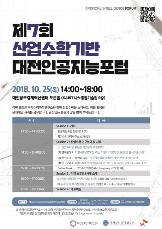 대전 인공지능포럼은 대전지역의 인공지능 관련 최신 기술과 동향을 소개하고, 미래 발전 방향에 대해 논의하는 지식 공유의 장이다. 이번 행사는 '산업수학'을 주제로 산업수학 개념과 연구분야 소개를 비롯해 인공지능, 빅데이터 분석 등 산업수학을 활용한 기업의 다양한 문제해결 사례가 발표될 예정이다.