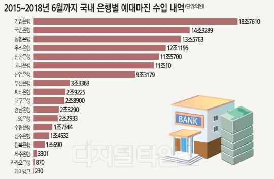 2015년부터 올해 상반기까지 예대마진 수입이 가장 큰 은행은 기업은행으로 18조7610억원을 벌어들였다. 이어 국민은행(14조3289억원), 농협은행(13조5763억원), 우리은행(12조1195억원), 신한은행(11조5700억원) 등의 순이었다.