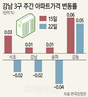 특히 강남 3구 아파트 값은 일제히 떨어졌다. 전주까지 0.01%, 0.03% 올랐던 강남구와 서초구의 아파트 값은 이번 조사에서 나란히 0.02%씩 내렸다. 서초구는 6월 셋째 주 이후 18주 만에, 강남구는 7월 셋째 주 이후 14주 만에 첫 하락이다. 역시 전주 0.01% 올랐던 송파구는 이번 조사에서 0.04% 하락했다. 7월 둘째 주 이후 15주 만의 하락으로, 강남 3구 내에서도 낙폭이 가장 컸다.