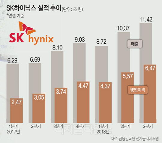 SK하이닉스는 연결 기준으로 3분기 매출 11조4168억원, 영업이익 6조4724억원, 순이익 4조6922억원을 기록, 모든 부문에서 사상 최대 신기록을 달성했다고 25일 공시했다. 영업이익률도 56.7%를 기록해 전 분기 53.7%를 상회했다. 이는 지난 2분기에 이어 두 분기째 신기록 행진이다.