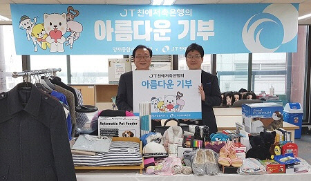 26일 서울 서초 양재종합사회복지관에서 열린 물품 기부식에서 윤병묵 JT친애저축은행 대표이사(왼쪽)가 박성균 양재종합사회복지관 부장에게 임직원에게 기증받은 물품을 전달하고 기념사진을 찍고 있다.