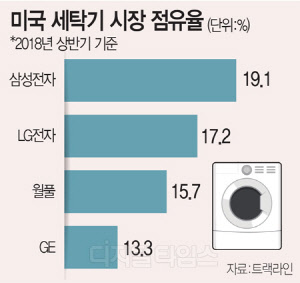 29일 미국 시장조사업체 트랙라인과 업계에 따르면 삼성전자는 올 상반기 미국 세탁기 시장에서 매출 기준 점유율 19.1% 기록해 1위를 차지한 것으로 집계됐다. 전체 생활가전 기준으로도 19.4% 점유율로 지난해에 이어 선두 자리를 유지했다.