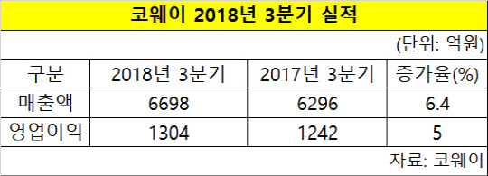코웨이는 올 3분기 매출액은 지난해 같은 기간보다 6.4% 오른 6698억원, 영업이익은 5% 증가한 1304억원을 기록했다고 30일 공시했다. 매출액과 영업이익 모두 역대 3분기 중 최대 실적이다.