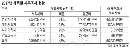 부과세 탈루자 상위 1%의 건수는 165건에 불과했지만 부과세액은 2조9753억원으로 전체의 48%를 차지했다. 상위 1% 가운데서도 법인사업자 비중이 높았다. 법인사업자는 51건에 대해 2조4438억원의 부과세액을 내면서 전체 상위 1% 부과세액의 82%를 차지했다.