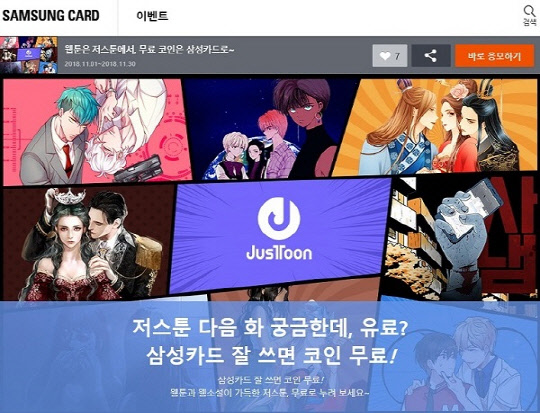 11월 한 달간 진행하는 이번 행사에서는 삼성카드로 10만원 이상 결제한 모든 고객에게 저스툰의 웹툰과 웹소설을 무료로 볼 수 있는 코인충전 혜택을 제공한다. 600여편의 독점 연재작과 20,000여편의 만화 및 비독점 소설을 서비스하고 있는 저스툰은 최근 웹툰 연재작 <그녀의 심청>으로 '2018 오늘의 우리만화'에 선정되는 등 풍부한 볼거리 뿐만 아니라 클라스가 다른 작품들로 인기를 얻고 있는 플랫폼이다.