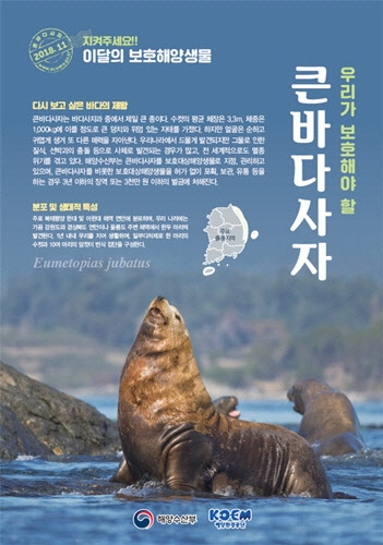 △1월 해송 △2월 귀신고래 △3월 두이빨사각게 △4월 검은머리물떼새 △5월 수거머리말 △6월 붉은바다거북 △7월 향고래 △8월 갯게 △9월 가시해마 △10월 슴새에 이어 11월 보호해양생물로 선정된 큰바다사자는 바다사자 중 가장 큰 몸집을 지녀 바다의 제왕으로 불리는 동물이다.