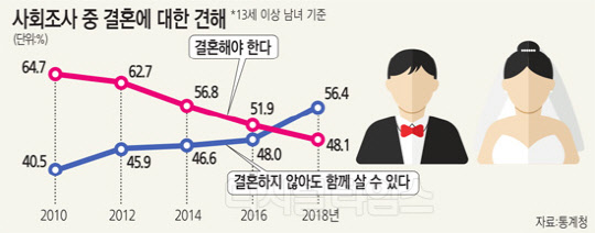 통계청은 지난 5월 16일부터 31일까지 전국 2만5843표본가구 내 상주하는 만 13세 이상 가구원 3만9000명을 대상으로 가족과 교육, 보건, 안전, 환경 등 5개 부문에 대한 조사를 진행했다. 조사 결과, 우리나라 13세 이상 인구 중 '결혼을 해야 한다'고 생각하는 비율이 48.1%를 기록해, 처음으로 절반 이하로 낮아졌다. 이 비율은 지난 201년 64.7%에 달해지만 매 조사마다 하락해 2016년에는 51.9%까지 떨어졌고, 이번 조사에서는 50% 밑으로 하락한 것이다.