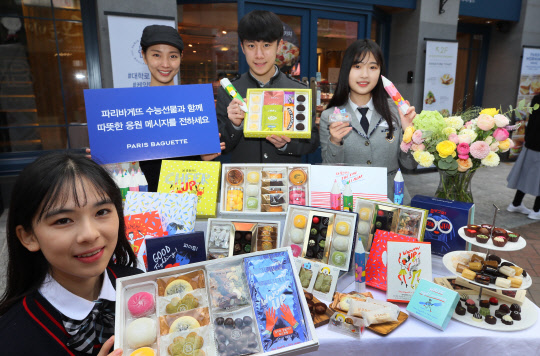 6일 서울 종로구 파리바게뜨 카페대학로점에서 고등학생 모델들과 직원들이 프랑스 작가 에디스 카홍의 일러스트와 '수능 응원' 문구가 더해진 수능선물 세트를 선보이고 있다.