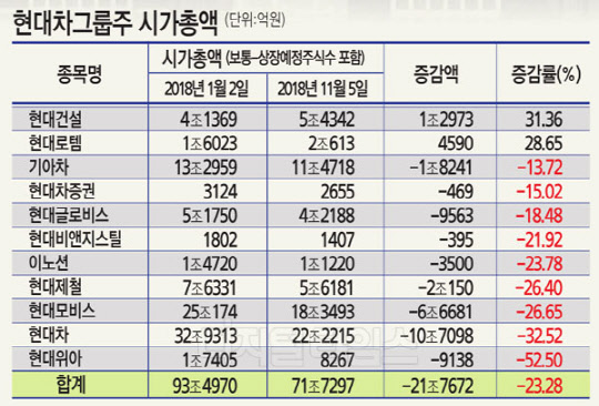 6일 한국거래소에 따르면 지난 5일 종가 기준으로 현대차그룹 상장 계열사 11곳의 시가총액은 71조7297억원으로, 연초 대비 21조7672억원(23.28%) 급감했다. 이 기간 현대차 시총은 10조7098억원이 날아갔다. 현대모비스(-6조6681억원)·현대제철(-2조150억원)·기아차(-1조8241억원) 등도 줄줄이 줄었다.