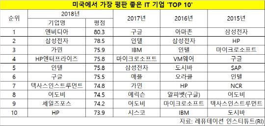 11일 재계에 따르면 미국 보스턴에 본부를 둔 글로벌 컨설팅 업체 '레퓨테이션 인스티튜트(RI)'가 최근 발표한 '2018년 미국에서 가장 평판 좋은 IT 기업' 순위에서 삼성전자는 평점 78.5점을 얻으면서 2위에 올랐다.