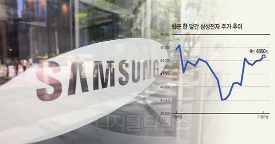 11일 한국거래소에 따르면 코스피 대장주인 삼성전자 주가는 4만4300원으로, 작년 11월9일 기록한 52주최고가 5만6920원(액면분할 환산 주가) 대비 22.2% 급락했다.