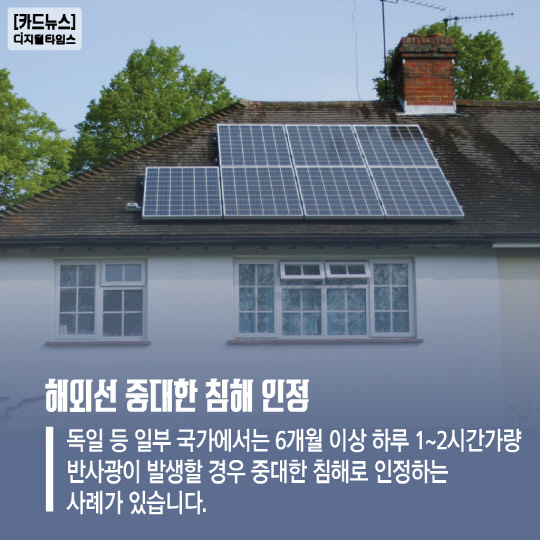 독일 등 일부 국가에서는 6개월 이상 하루 1~2시간가량 반사광이 발생할 경우 중대한 침해로 인정하는 사례가 있습니다.